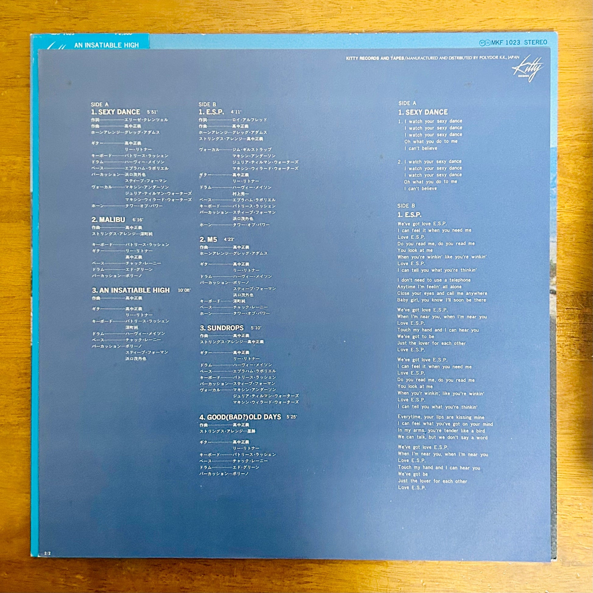 | Comment | A stacked session with Ponta Murakami, Jun Fukamachi, Shigeya Hamaguchi, and more. Includes the bright guitar-led groover “Sexy Dance,” the Patrice Rushen–styled mellow groove “Malibu,” the percussion-driven fusion burner “An Insatiable High,” the vocal disco tune “E.S.P.,” the sought-after mellow cut “Sundrops” with its fat drum break intro, and the fast fusion-samba “M5.” A highly coveted Japanese fusion classic overseas. |